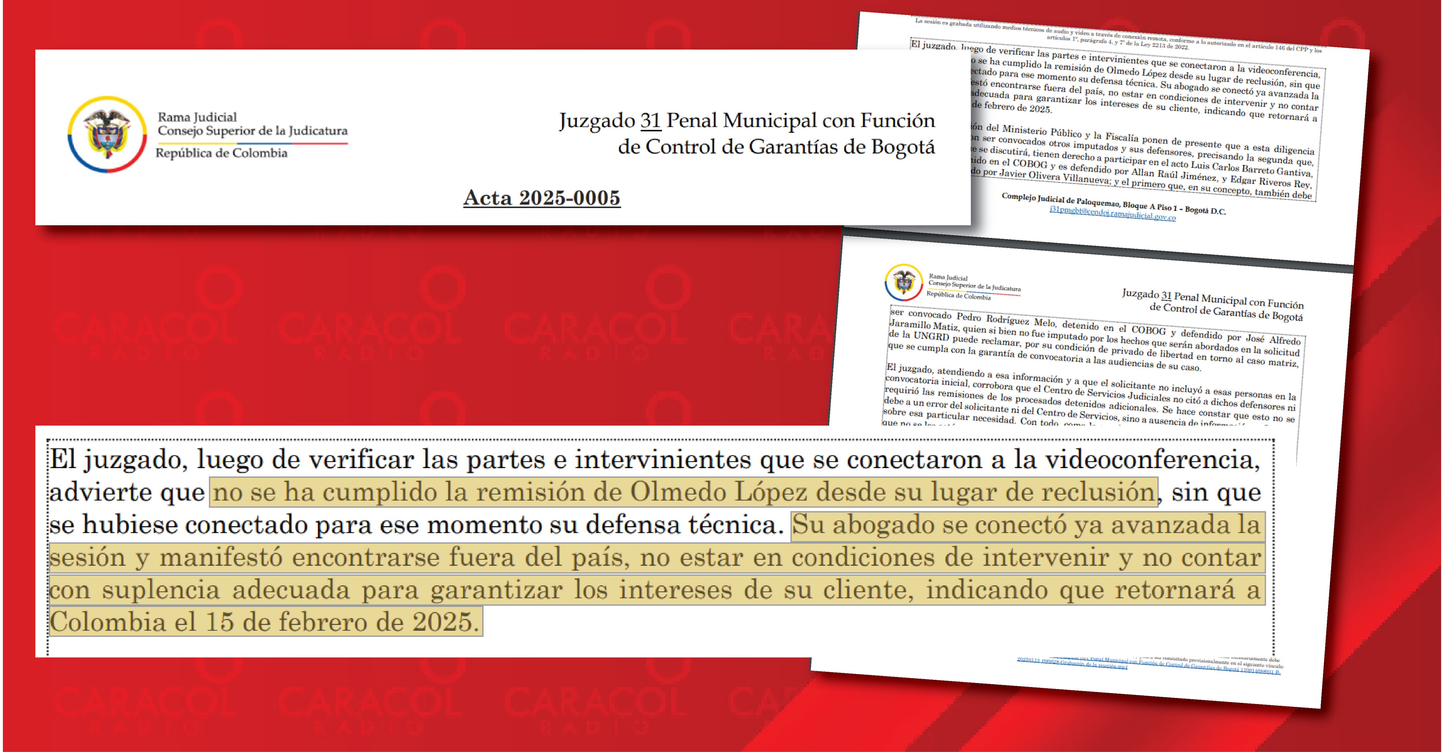 Respecto del abogado de Olmedo López, no está en Colombia, y a pesar de que se conectó a la diligencia, dijo que no estaba en capacidad de intervenir, tampoco de designar un suplente por lo que solicitó reprogramar la diligencia para febrero, fecha en que regresa al país, petición que el juez le concedió.