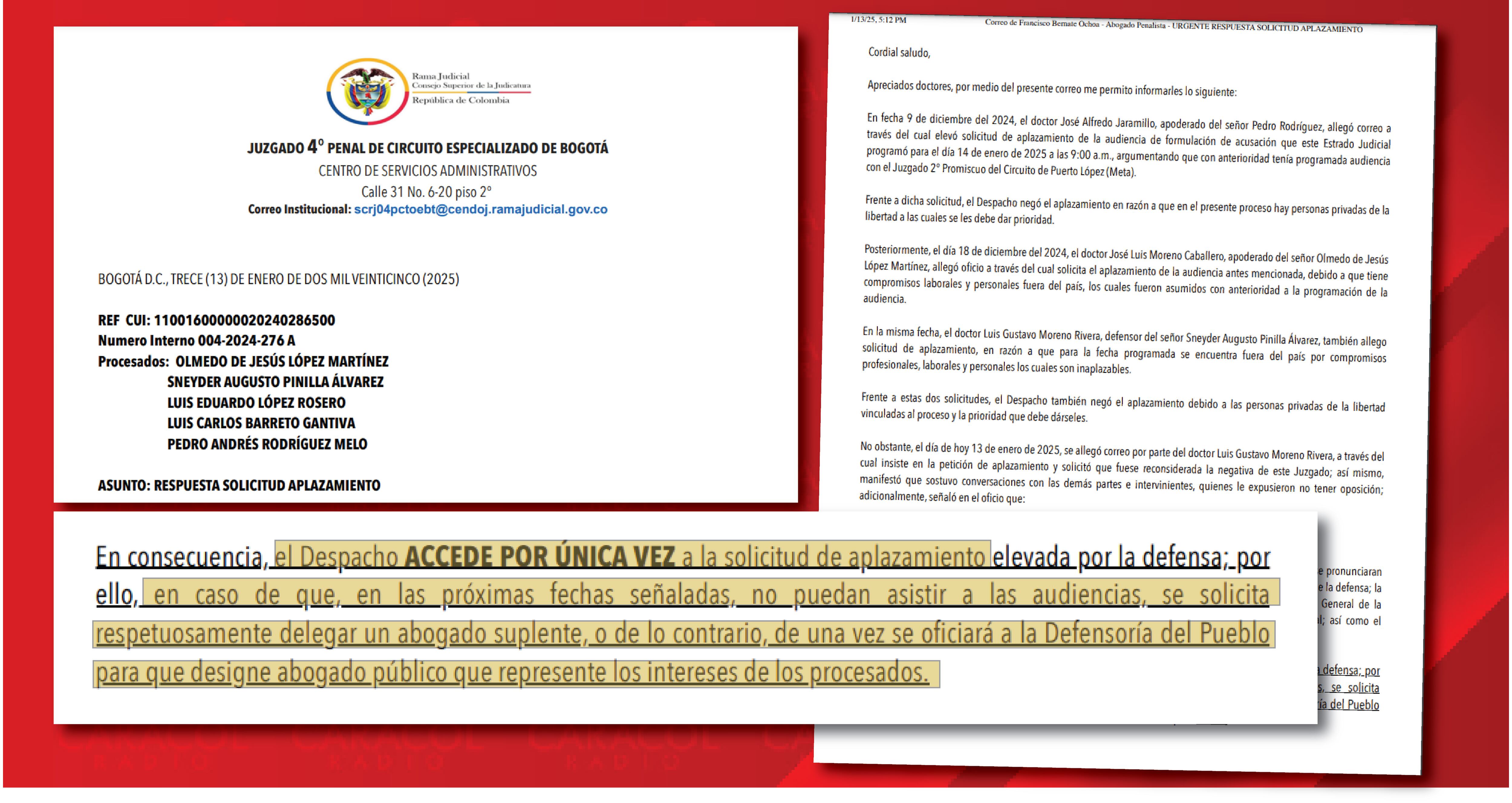 En el acta conocida por Caracol Radio, el juez 4 Penal Especializado de Bogotá les advirtió a todos los abogados que por única aplazaba esa audiencia y si en la próxima diligencia no están, tendrán que delegar un suplente o de lo contrario “se ociará a la Defensoría del Pueblo para que designe abogado público”.