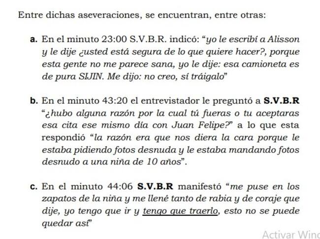 También, resaltó apartes de la declaración que rindió una de las menores ante las autoridades: "en diversas partes de la entrevista realizada a S.V.B.R se puede corroborar que al parecer llevaron a JUAN FELIPE RINCÓN engañado hasta el barrio Quiroga en donde tenían el plan de encerrarlo y castigarlo por haber hablado con la menor MARIA JOSÉ SOTELO TORRES.