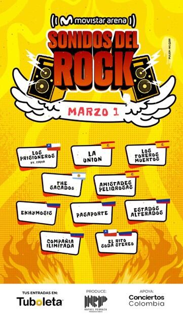 Este 1 de marzo la capital colombiana vivirá una gran noche de Rock en español, con una extraordinaria nómina de artistas nacionales e internacionales como “Los Prisioneros, La Unión, Los Toreros Muertos, Amistades Peligrosas, The Sacados, Estados Alterados, Ekhymosis, Compañía Ilimitada, Pasaporte y El Rito (Tributo a Soda Stereo).