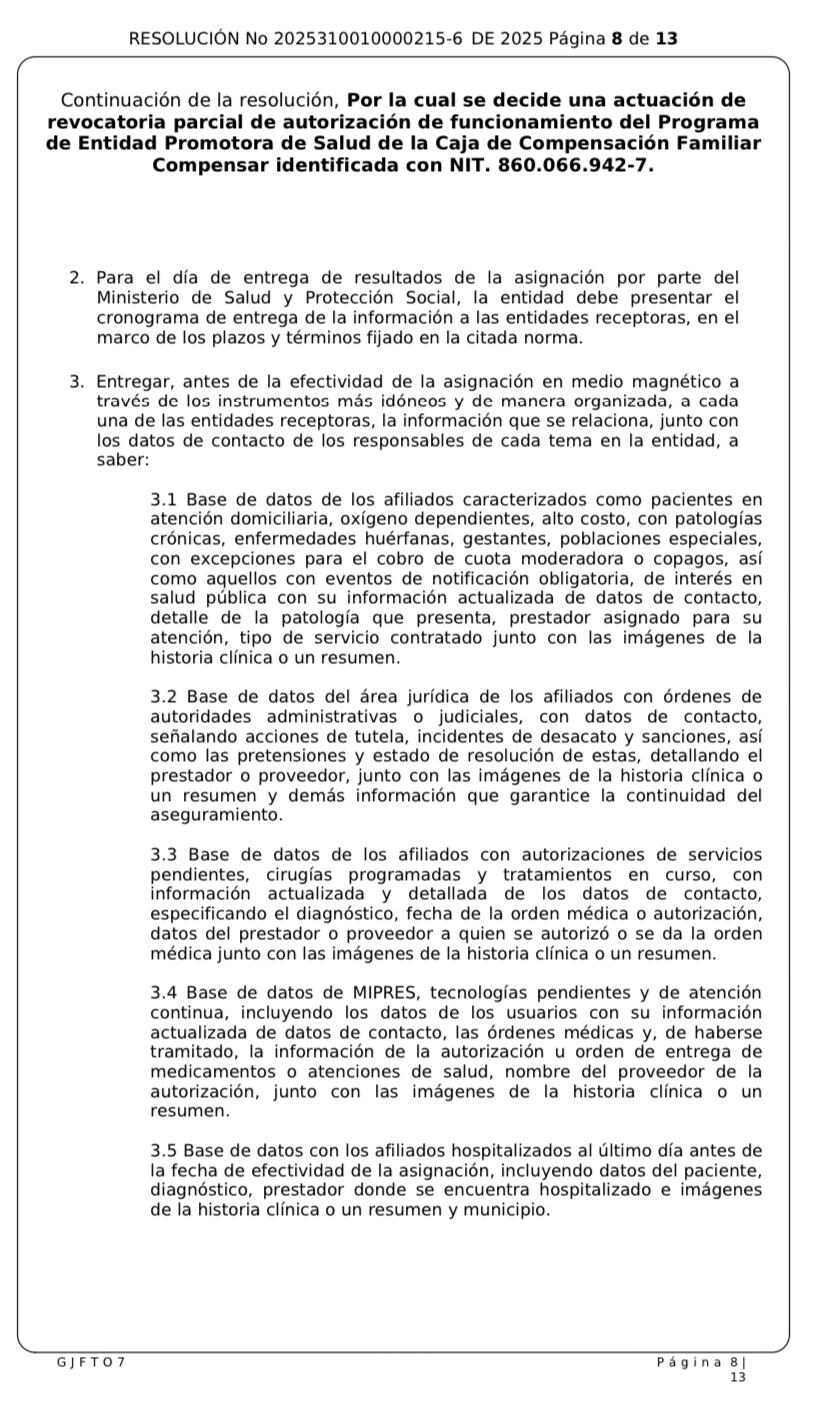 Mientras surte dicho proceso, Compensar deberá garantizar la continuidad de sus servicios a los más de 196.000 afiliados de los 10 departamentos, hasta que se realice el traslado, y posteriormente deberá interrumpir de manera inmediata las actividades relacionadas con la afiliación como EPS.