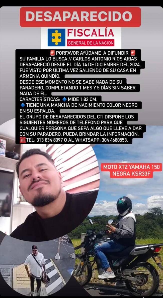 Un verdadero drama vive los familiares de Carlos Antonio Ríos Arias que está desaparecido desde el 14 de diciembre del 2024 cuando salió de su apartamento ubicado en conjunto Parques de Bolívar en su moto XTZ Yamaha 150 negra de placas KSR 33F y no se sabe nada de su paradero