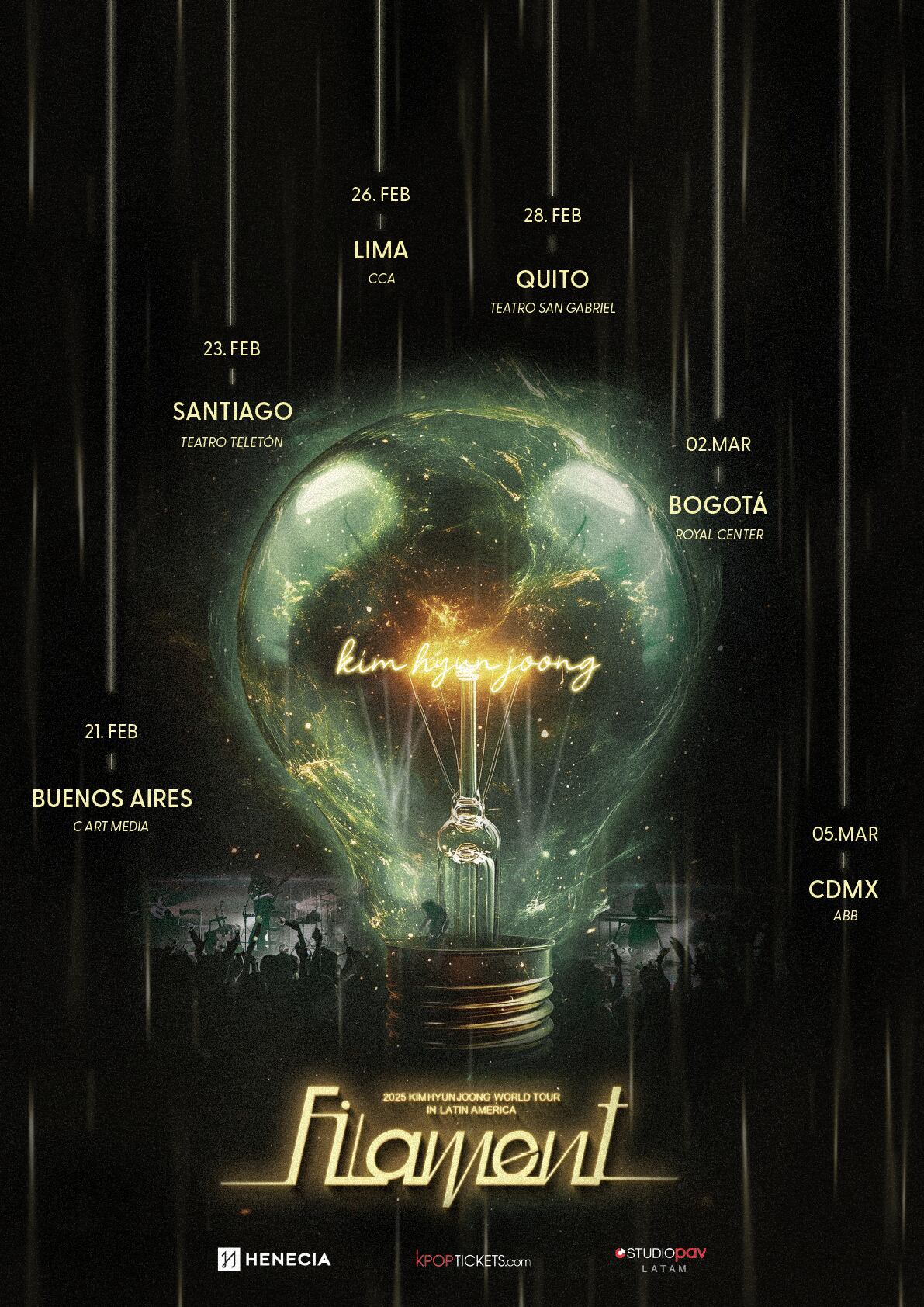 El 2025 KIM HYUN JOONG LATIN AMERICA TOUR presentará lo mejor de su repertorio musical, incluyendo éxitos de álbumes como Love Universe, Lucky, y The Moon, The Sun and Your Song. La gira incluirá las siguientes paradas confirmadas: