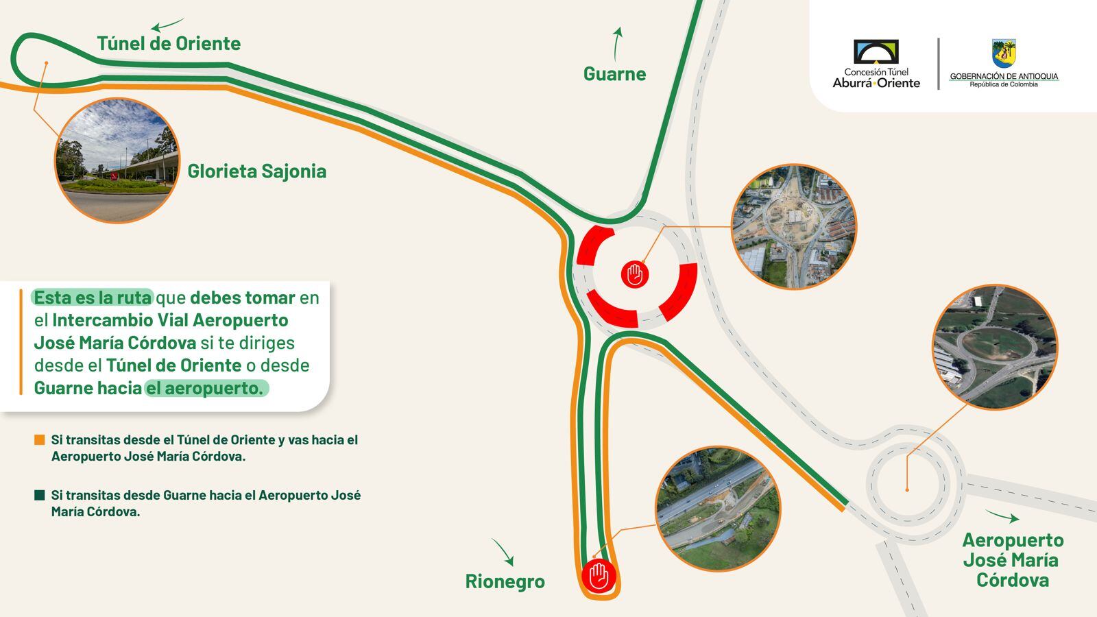 La Gobernación de Antioquia y la Concesión Túnel Aburrá Oriente anunciaron que las obras del Intercambio Vial Aeropuerto José María Córdova alcanzaron el 62% de avance, y para las obras del costado sur de la actual glorieta, se habilitará a partir del próximo lunes 27 de enero, el retorno sur que se construyó en la vía en Llanogrande, hacia el municipio de Rionegro. Los vehículos que se desplacen desde el Túnel de Oriente o Guarne hacia el aeropuerto deberán acceder al retorno luego del desvío actual en la glorieta Sajonia para continuar su ruta.