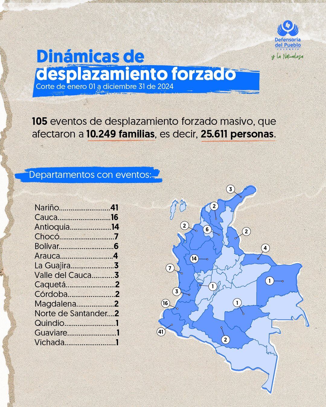En el año 2024 se registraron en Colombia 105 eventos de desplazamiento forzado, afectando a 10.249 familias, unas 25.611 personas. Se registraron principalmente en Nariño: 41; Cauca 16, y Antioquia 14. En Norte de Santander, donde se vive esta emergencia, se registraron 2 eventos de desplazamiento forzado.