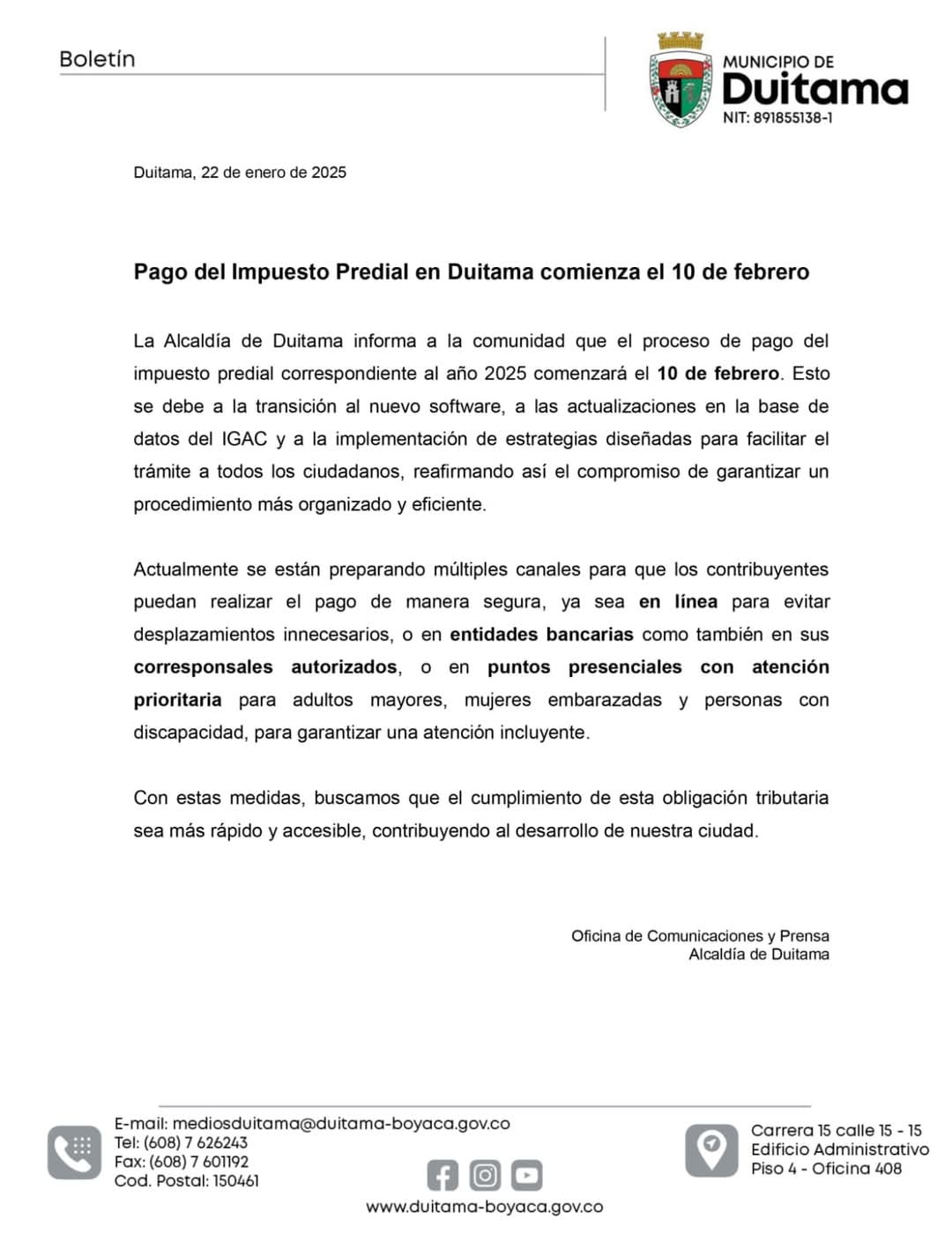 La emisión de la liquidación del impuesto predial en la ciudad de Duitama comenzará el próximo lunes 10 de febrero.