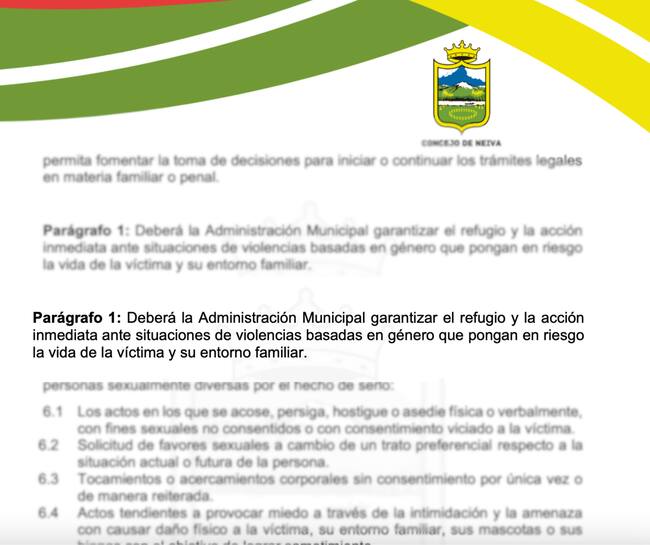 Adicional a la normativa nacional, en el año 2024 fue aprobado el Proyecto de Acuerdo 030 de 2024 “Neiva sin Violencias, Neiva sin Acoso”, en el Concejo de Neiva, en su artículo 5, parágrafo 1 indica, “Deberá la Administración Municipal garantizar el refugio y la acción inmediata ante situaciones de violencias basadas en género que pongan en riesgo la vida de la víctima y su entorno familiar”.