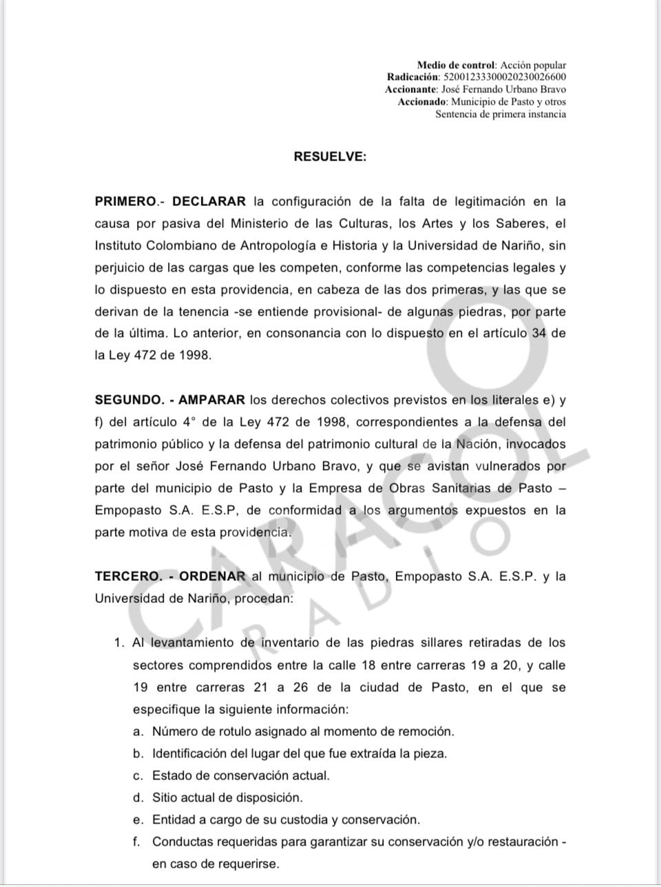 Tribunal ordena al municipio, Empopasto y la Universidad de Nariño a establecer el inventario y custodia del material de importancia histórica retirado.