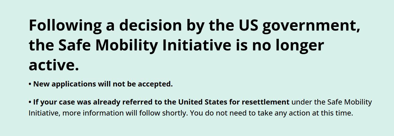 Las oficinas de Movilidad Segura indican que “si su caso ya fue remitido a los Estados Unidos para su reasentamiento en virtud de la Iniciativa de Movilidad Segura, en breve le enviaremos más información. No necesita tomar ninguna medida en este momento”.