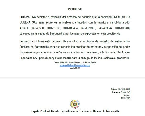 Ante esto el Juez indicó que: “De manera que los argumentos y la evidencia presentada lleva a concluir que la Fiscalía General de la Nación no logró demostrar que los bienes cuestionados son constitutivos de un incremento económico injustificado de la sociedad Promotora Dubrera SAS, persona jurídica titular de dominio de los inmuebles identificados con la matrícula inmobiliaria 040-409404, 040- 42714, 040-81959, 040-409404, 040-409346, 040-409347, 040-409348, ubicados en la ciudad de Barranquilla”.