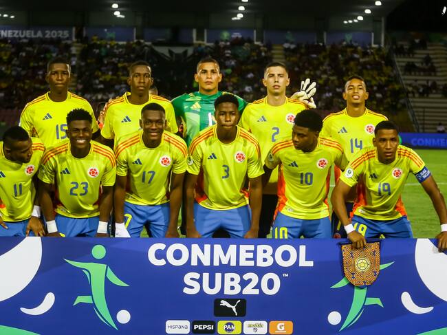 Jugadores de Colombia forman en el Campeonato Sudamericano sub-20 que se está disputando el estadio Polideportivo Misael Delgado en Valencia (Venezuela). EFE/ Juan Carlos Hernández / Juan Carlos Hernández (EFE)