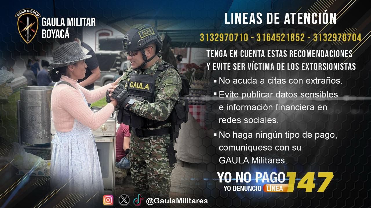 Las campañas de prevención de extorsiones en el departamento por parte del Gaula Militar Boyacá seguirán realizándose en este 2025 en los municipios.