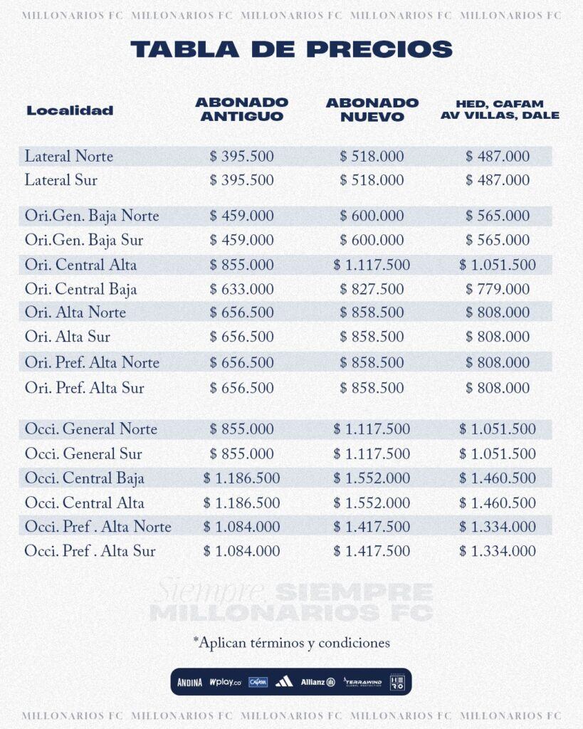 Precios de los abonos de Millonarios 2025-I / Imagen tomada de Millonarios