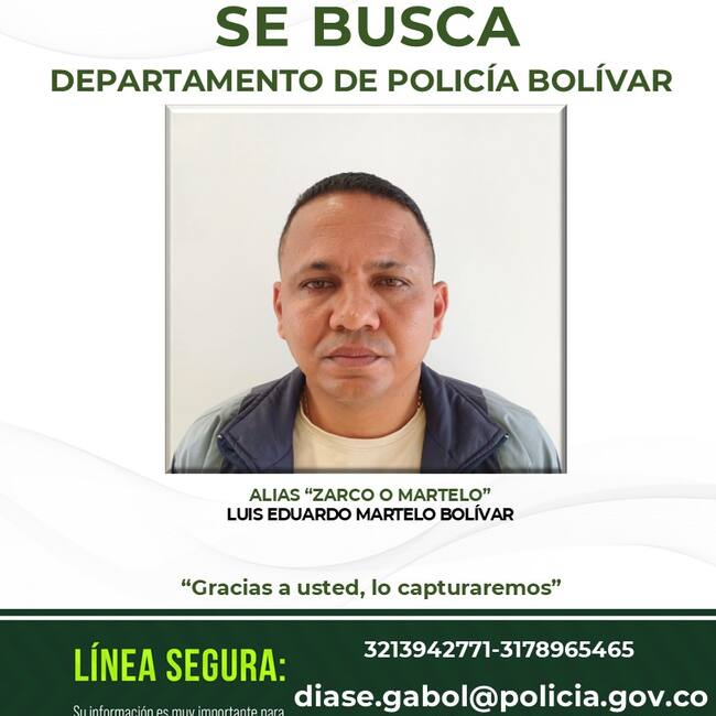 La Policía Nacional en Bolívar, solicitó la colaboración de la ciudadanía para dar con el paradero de un hombre identificado como Luis Eduardo Martelo Bolívar, alias “Zarco” o “Martelo”, quien presuntamente sería responsable de cobrar las extorsiones del Clan del Golfo, a comerciantes y tenderos en la zona norte de Bolívar.