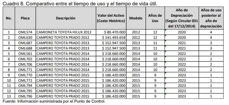 El hallazgo está relacionado con que 13 carros del Concejo superaron la vida útil, es decir, según la circular 031 del 17 de diciembre de 2014, los vehículos pequeños deben tener un uso hasta los ocho años y actualmente hay algunos que ya ajustan hasta 12 años.