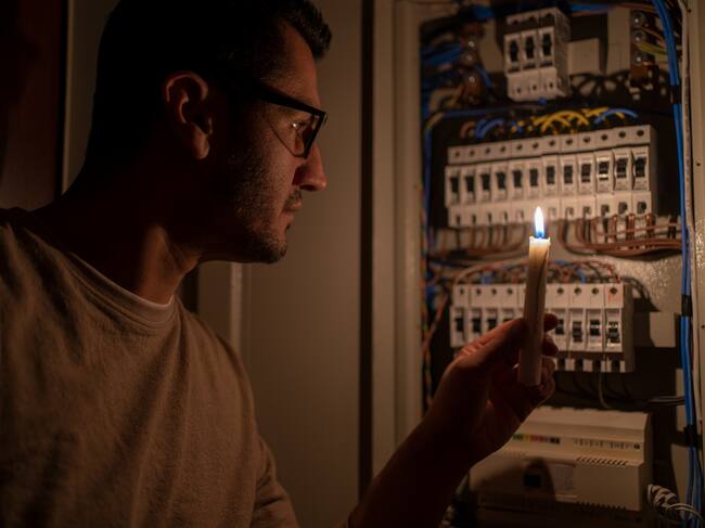 Hombre observando la caja eléctrica de su hogar con una vela porque se fue la luz (Foto vía Getty Images) / aquaArts studio