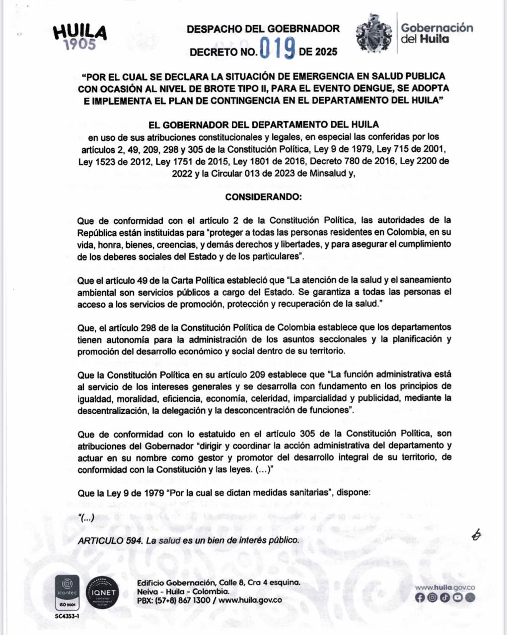 Mediante Decreto 019 de 2025, el Gobierno Departamental tomó la decisión de declarar la Emergencia en Salud Pública por la confirmación de un brote de Dengue Tipo II que viene afectando la salud de los huilenses.