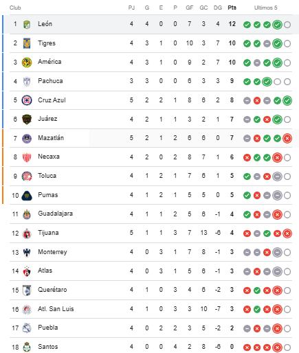 León, todavía con un partido menos ante Pachuca, es líder parcial del fútbol mexicano con 12 puntos de 12 posibles. Lo siguen, aun sin jugar en esta fecha, Tigres y América, ambos con 10 unidades. Precisamente los Tuzos, con dos juegos pendientes, suman 9 puntos.