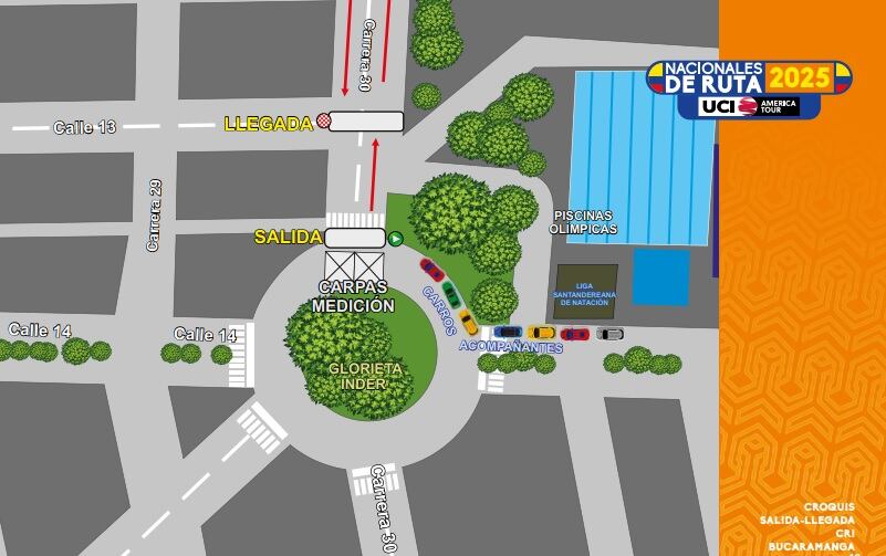 - Estadio - carrera 30 - calle 10 - carrera 27 - calle 70 - anillo vial - calle 45 - carrera 27 calle 10 - carrera 30 calle 13 estadio - 6 vueltas.