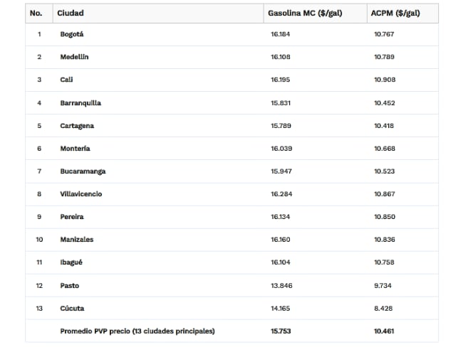 Aunque el valor varía según la ciudad, en promedio, el costo de la gasolina incrementó $95 pesos, llegando a un coste promedio de $15.753 pesos por galón, por su lado, el ACPM aumentó $38 pesos, fijándose, en promedio, a $10.461 pesos.