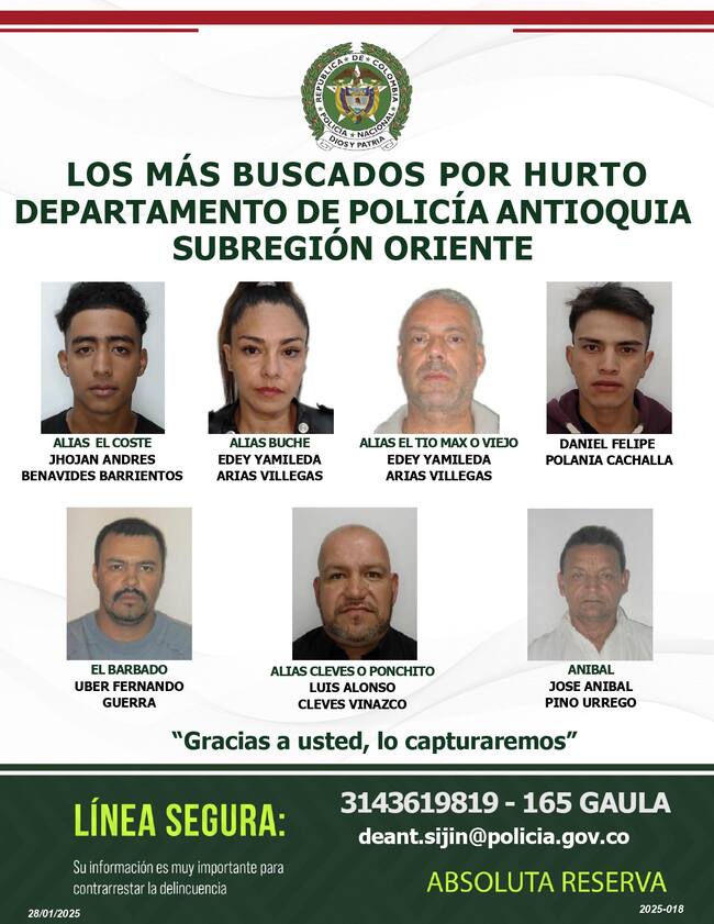 En el mismo sentido, la policía de Antioquia hace público el cartel con los siete rostros de los delincuentes más buscados por el delito de hurto en la subregión del Oriente del departamento; en este caso, las autoridades no los señalan de pertenecer a algún grupo delincuencial específico y más bien de delincuencia común.
