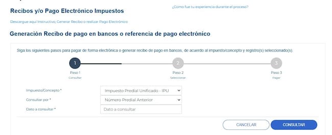 Ahí se desplegará una nueva ventana de IMPUESTOS en donde aparecerá la opción de generar recibo de pago y/o pago en línea, allí podrá consultar cuánto debe pagar escribiendo el número de cédula o el número del impuesto predial.