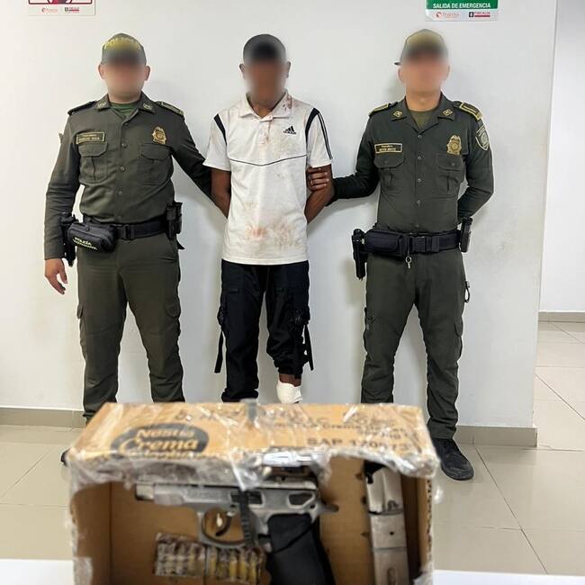 En el procedimiento se le incautó un arma de fuego tipo pistola calibre 9 mm con 10 cartuchos de igual calibre, el detenido es conocido con el alias ‘El Bebé’ presenta ocho anotaciones judiciales por los siguientes delitos: tres por fabricación, tráfico, porte o tenencia de armas de fuego, accesorios, partes o municiones de los años 2018 y 2021, una por amenaza 2018, otra por hurto 2020, fuga de presos, 2019, 2020, 2021 y concierto para delinquir en el año 2021.