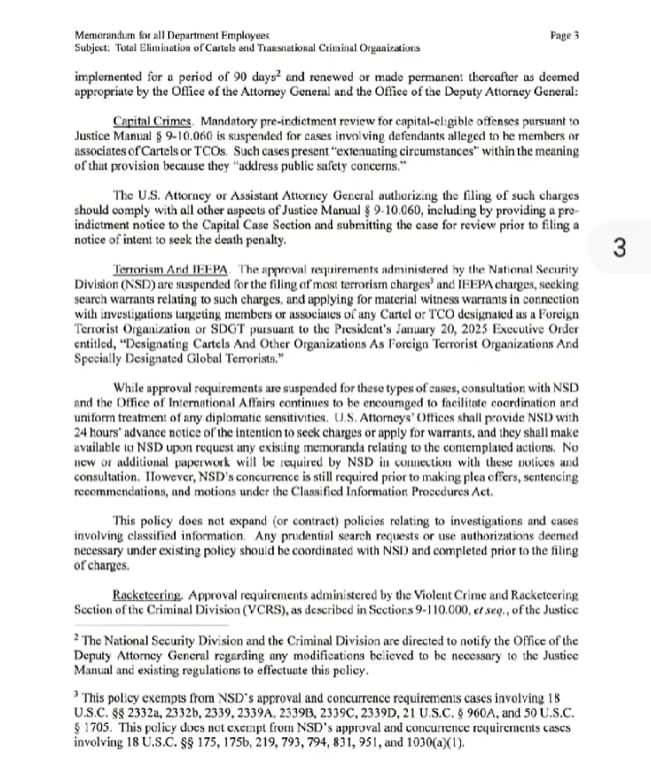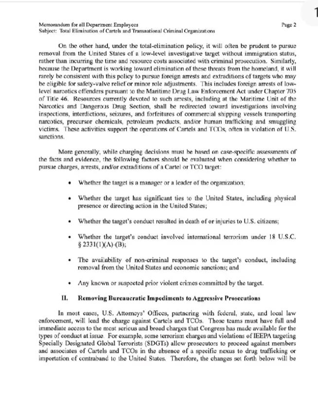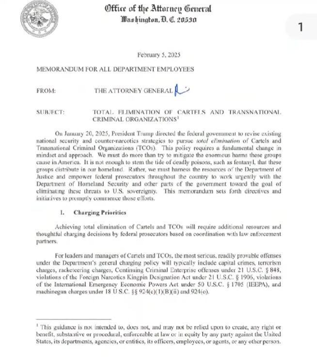 En dicho documento, con fecha 5 de febrero de 2025, el Departamento de Justicia de Estados Unidos, puntualmente a través de Fiscalía General, emitió un memorándum que establece nuevas directrices para combatir los cárteles de droga y las organizaciones criminales transnacionales (TOC, sigla en inglés de Transnational Organized Crime).