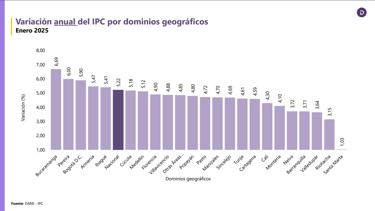 La lista de ciudades más costosas para vivir de Colombia, fue encabezada por Bucaramanga, con una inflación de 6,69 %, y después de Pereira, estuvieron la ciudad de Bogotá con un IPC de 5,90 %, Armenia con 5,47 %, e Ibagué con 5,41 %.