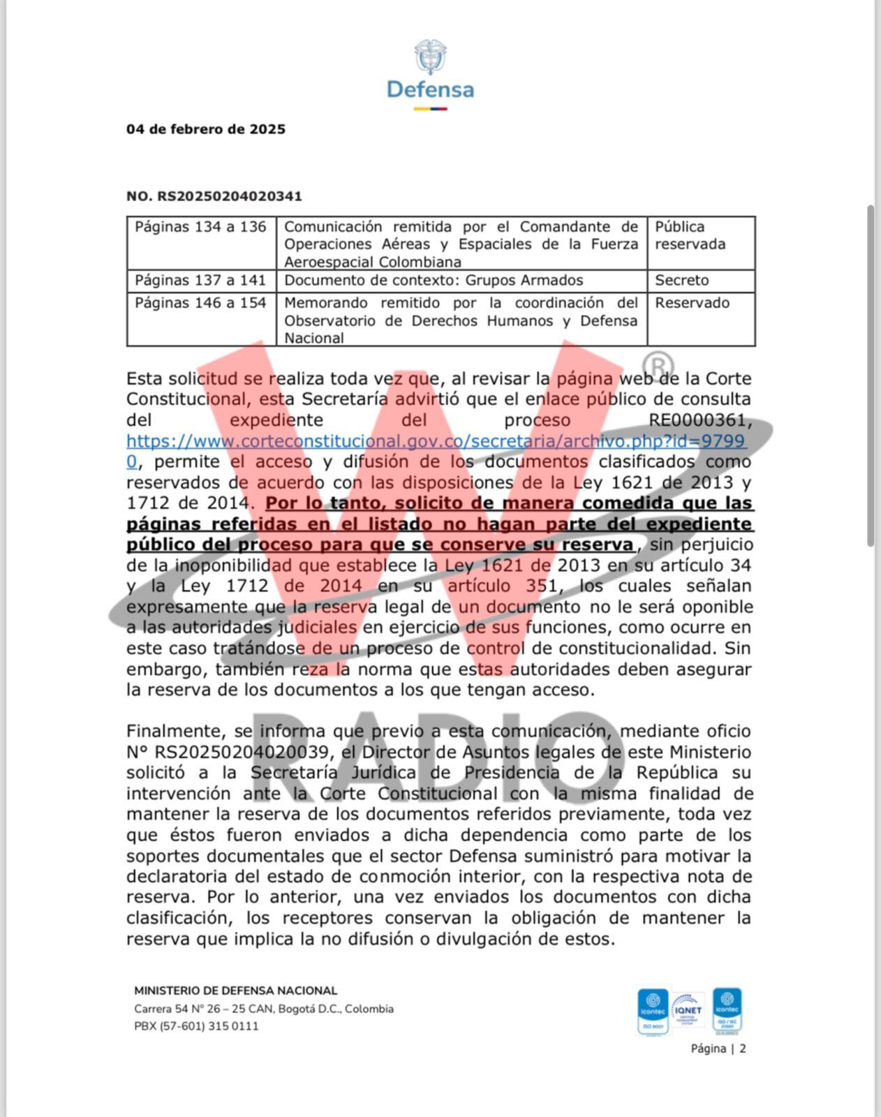 Según los documentos que conoció La W, la información fue radicada ante la Corte Constitucional el 27 de enero sin ningún tipo de reserva. Sin embargo, días después en un oficio radicado, se pidió, por parte del Ministerio de Defensa, bajar la información de la página de internet del alto tribunal, que duró publicada hasta el 4 de febrero de 2025. Es decir, 7 días en donde miles pudieron acceder a estos datos clave sin ningún tipo de control.