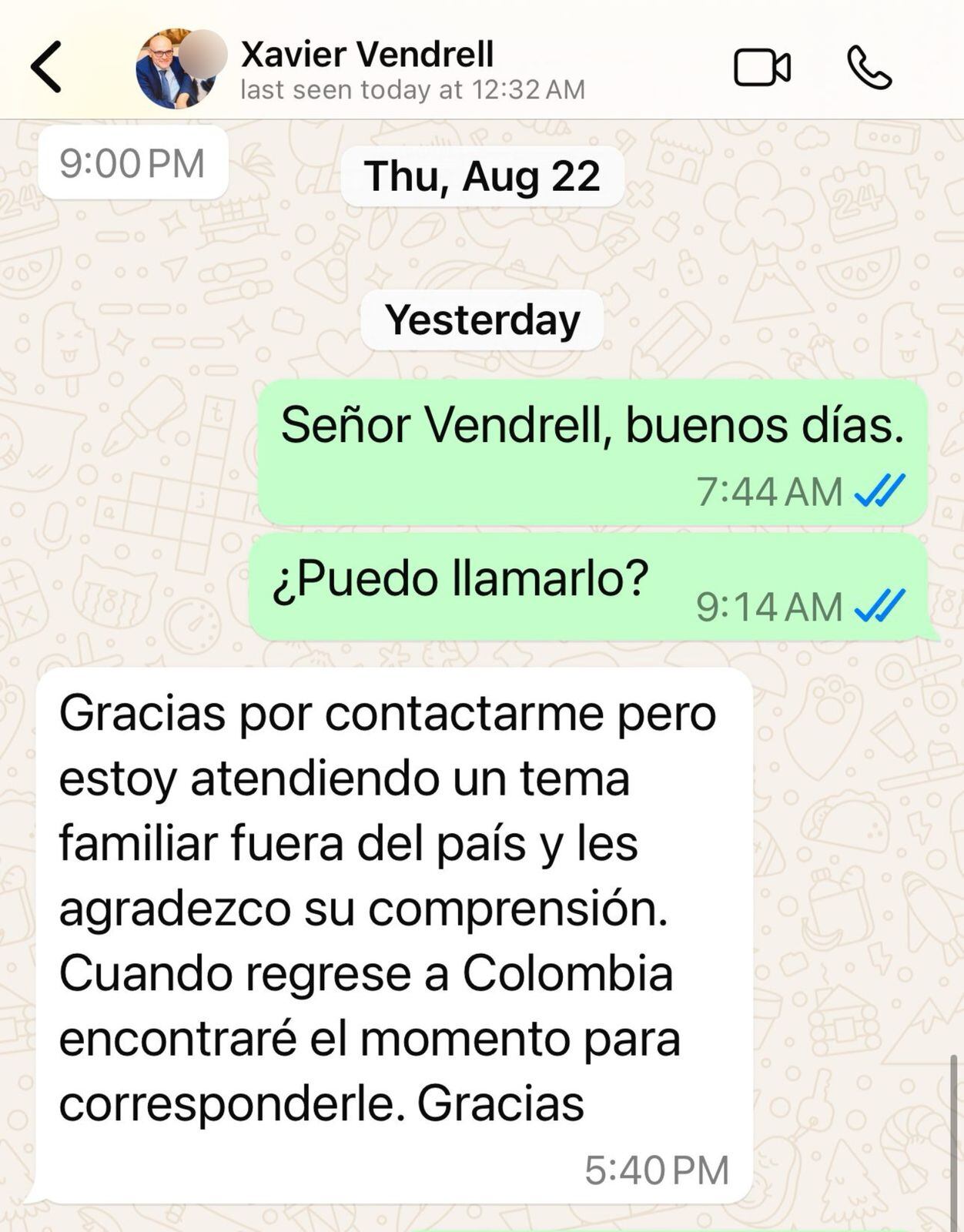 - “Gracias por contactarme, pero estoy atendiendo un tema familiar fuera del país y les agradezco su comprensión. Cuando regrese a Colombia encontraré el momento para corresponderle. Gracias”.