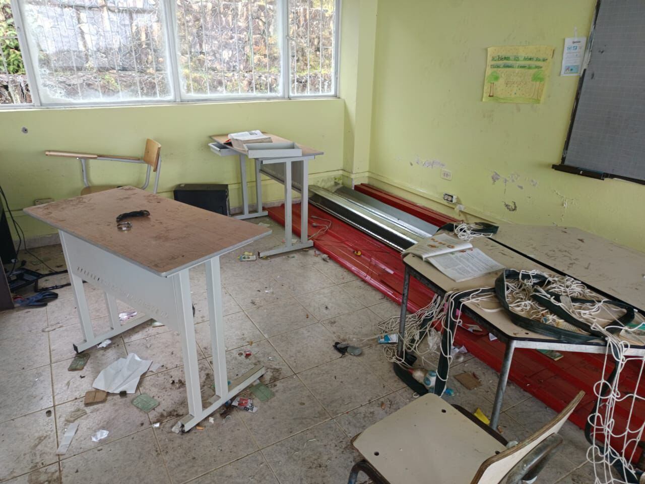 La infraestructura de la institución evidencia múltiples impactos de arma de fuego, así como daños en los elementos de cómputo, el mobiliario educativo en incluso rastros de sangre en su interior.