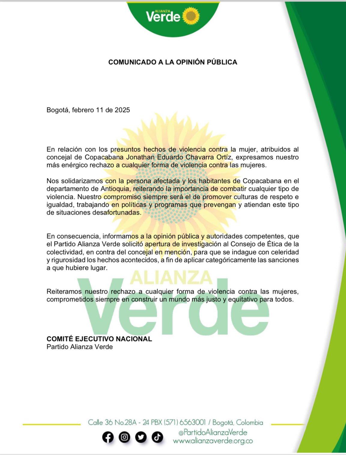 El partido político Alianza Verde se pronunció mediante un comunicado de prensa sobre las denuncias que se han conocido desde el pasado mes de enero de 2025 contra el concejal del municipio de Copacabana Jonathan Eduardo Chaverra Ortiz. Quien presuntamente agredió física y psicológicamente durante más de un año a su expareja sentimental, denuncia que hizo la misma afectada. En su momento manifestó que incluso por los golpes que recibió en estado de gestación había perdido un bebé.