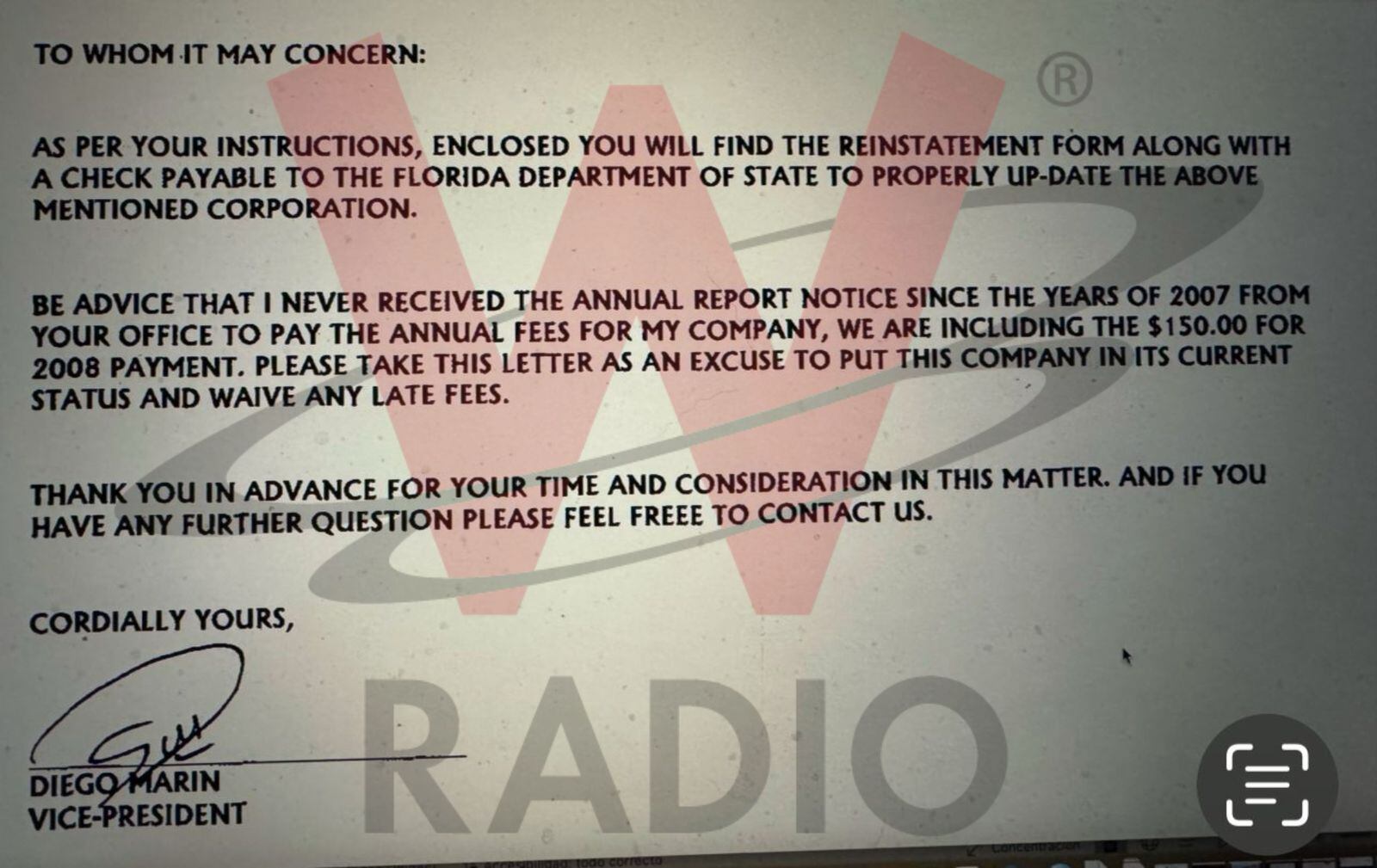 Ese año, el propio ‘Papá Pitufo’ envió una carta en inglés a las autoridades de Florida pidiendo que “Colombiana de Aduanas” fuera reinscrita y anexando un cheque por 150 dólares como pago del trámite. Ustedes pueden ver la nota firmada por él en la página de La W.