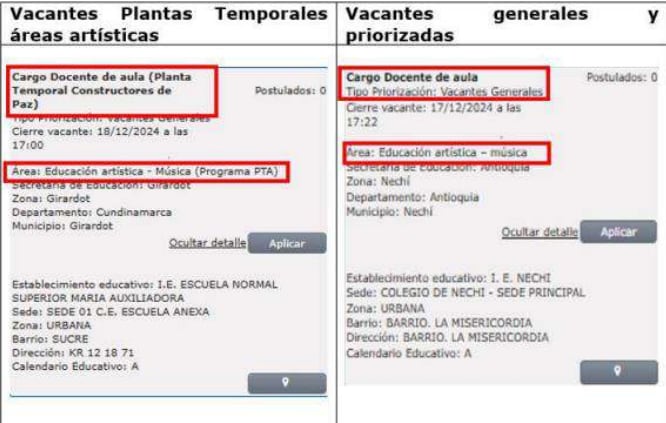 Para identificar los cargos docentes en áreas artísticas dentro del mapa de búsqueda de vacantes, a continuación, se muestra un ejemplo como quedarán caracterizadas en Sistema Maestro: