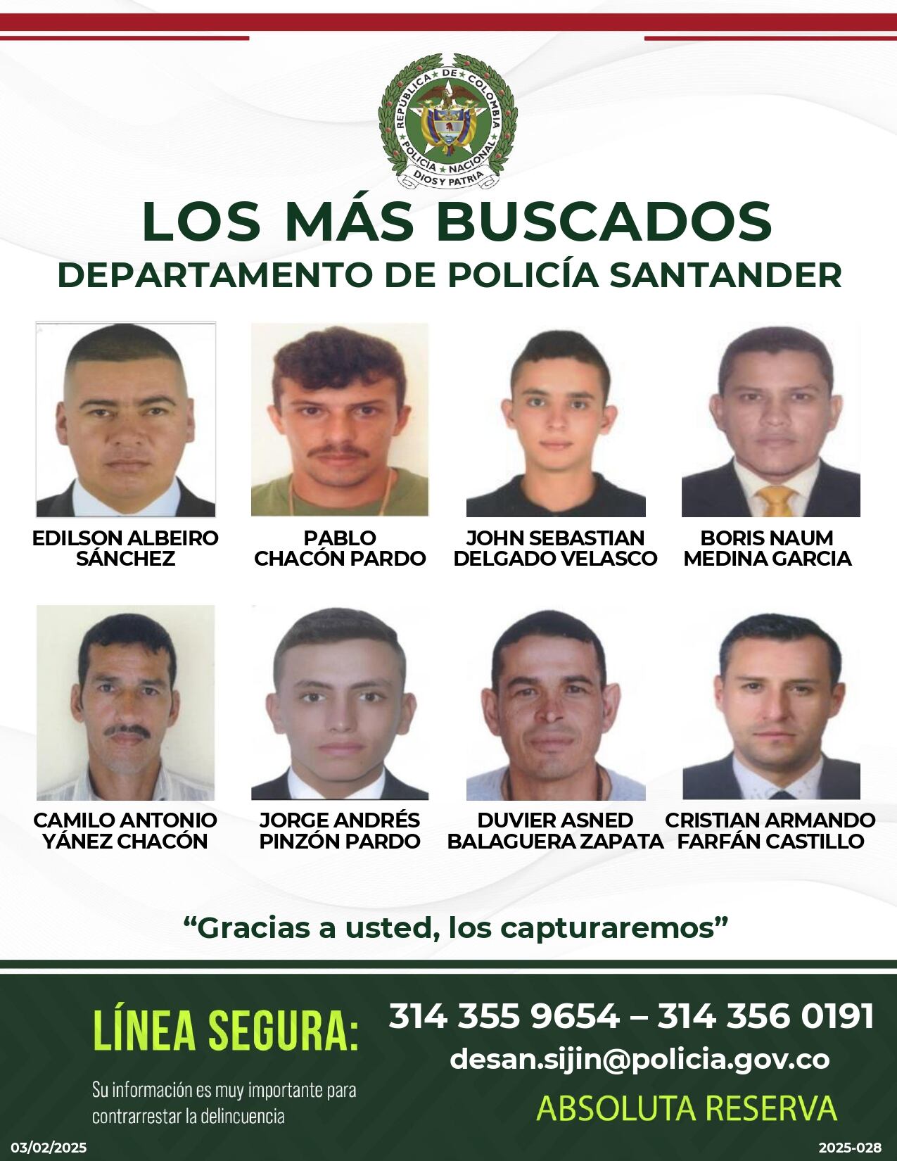 El Director de seguridad y convivencia ciudadana de Santander manifestó: “El primer cartel ofrece como recompensa de hasta 8 millones de pesos por los más buscados, los cuales están plenamente identificados y cuentan con orden judicial vigente por los delitos que afectan la vida, la integridad personal, como: feminicidio, homicidios, tentativa de homicidios y violencia intrafamiliar, que para nosotros es un factor supremamente importante”.