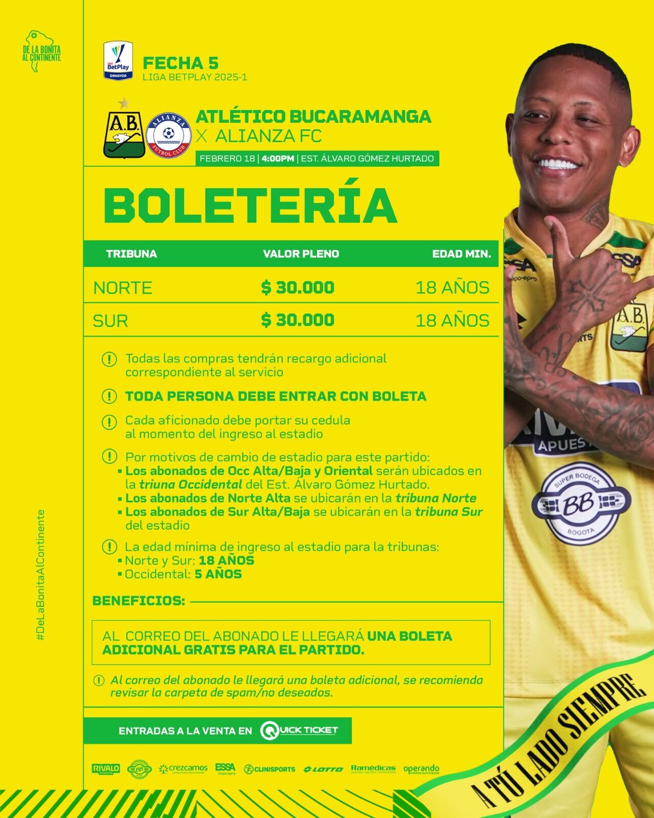 El Club Atlético Bucaramanga dio a conocer los precios de la boletería y tribunas disponibles para el partido que disputará ante el Alianza FC, este martes 18 de febrero a las 4:00 de la tarde, en el Estadio Álvaro Gómez Hurtado.