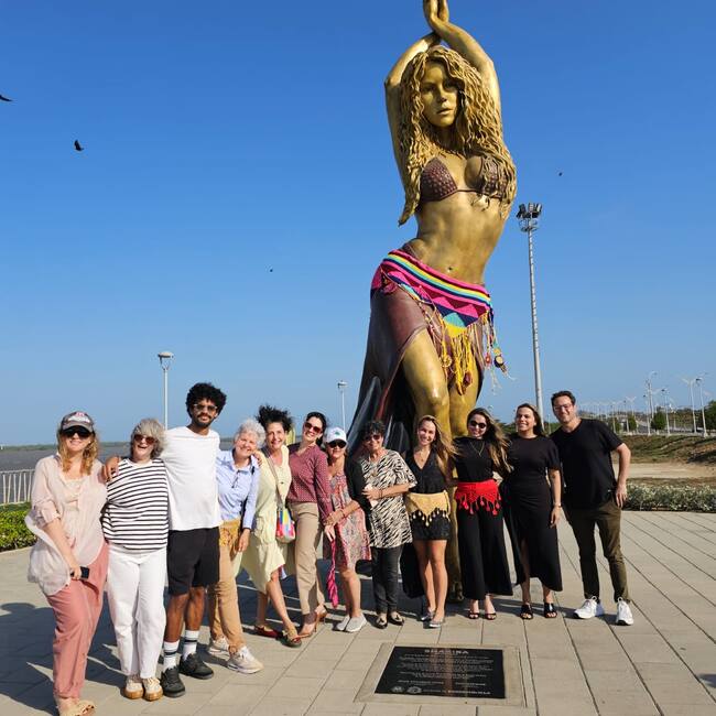 La estatua de Shakira, ubicada en el Gran Malecón de Barranquilla, recibió un toque único y lleno de tradición tras el caderín, elaborado por la talentosa Amalín de Hazbún junto a su hija Judy y más de 600 tejedoras de la ciudad, quienes lideraron esta iniciativa que ahora adornará las caderas de la figura de la artista barranquillera.
