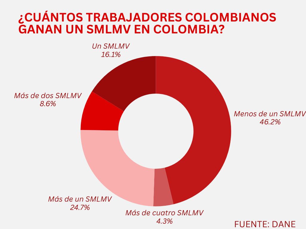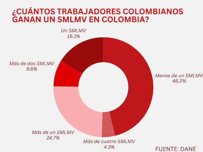 Según cifras del Departamento Administrativo nacional de Estadística (DANE), en Colombia, alrededor de 3,3 millones de personas económicamente activas solo reciben un solo salario mínimo, el cual se encuentra en $1.423.500 para 2025.
