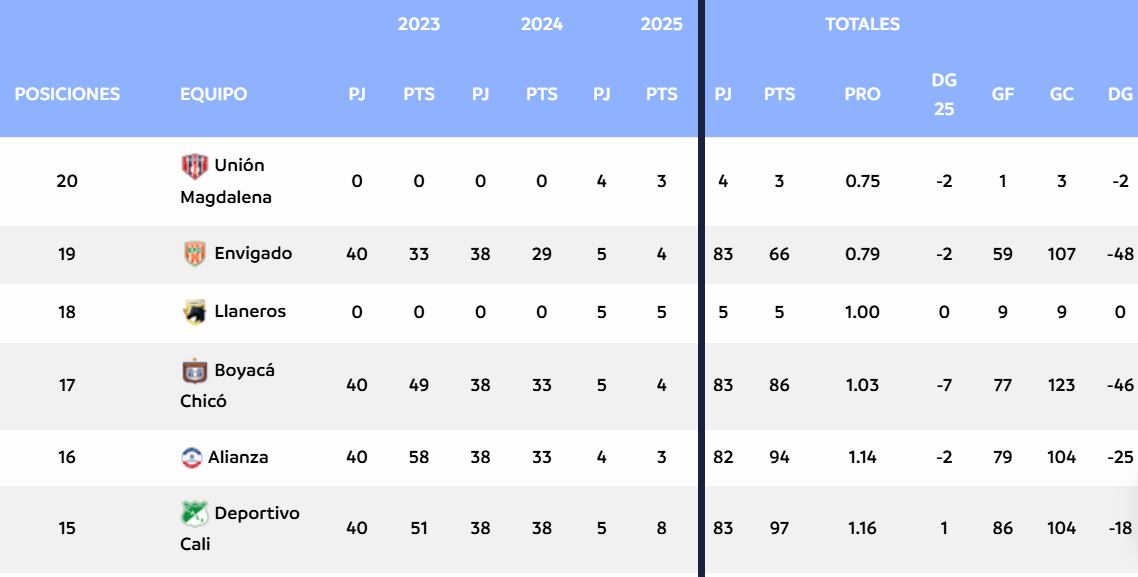Uno de los más complicados en esta clasificación es Envigado, que acarrea con las malas campañas de los últimos dos años y esto lo tiene en una posición complicada. En el 2024 se salvó por la sumatoria de unidades en el segundo semestre, pero este 2025 el objetivo central será no perder la categoría.