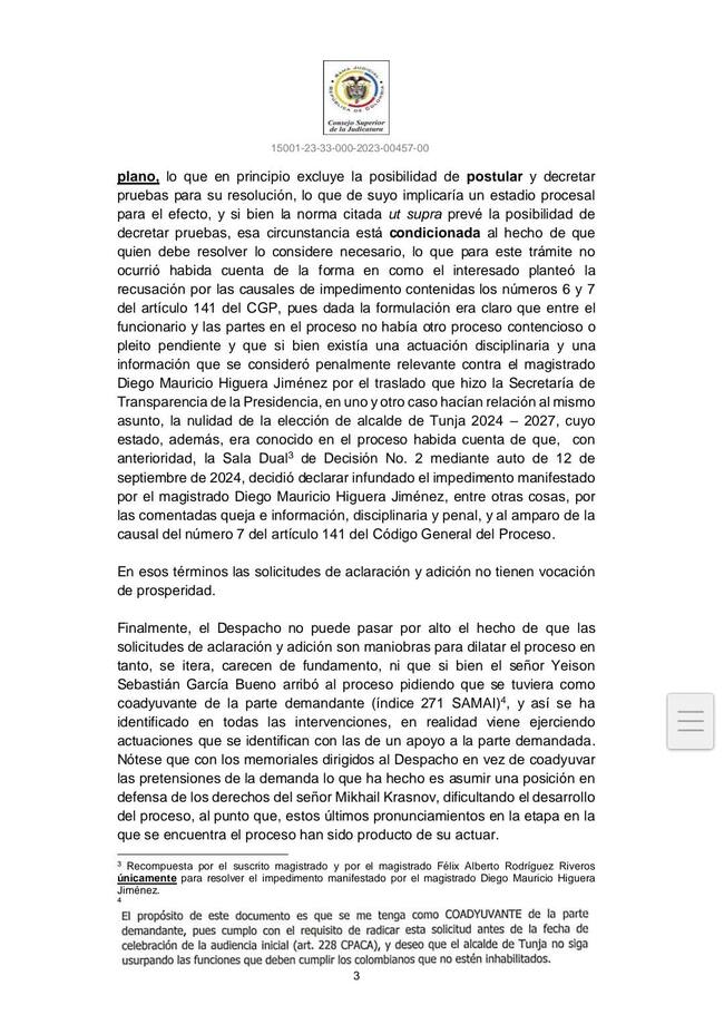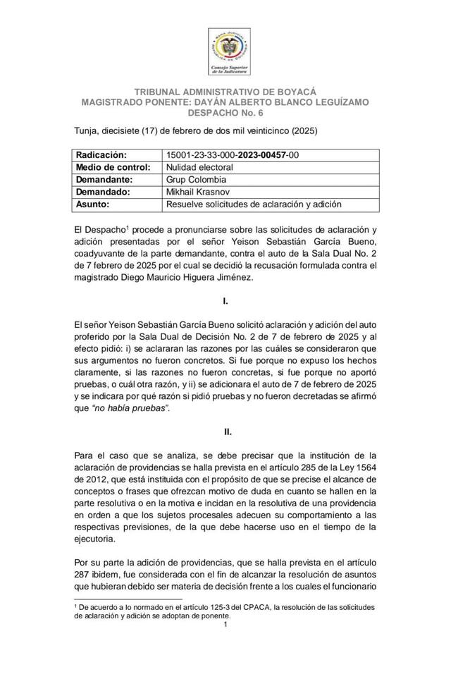 En Auto del 17 de febrero de 2025 el despacho del magistrado del Tribunal Administrativo de Boyacá, Dayán Alberto Blanco Leguízamo se pronunció sobre las solicitudes de aclaración y adición presentadas por Yeison Sebastián García Bueno, coadyuvante de la parte demandante, contra el auto expedido el 7 de febrero por la Sala Dual en la que se decidió la recusación formulada contra el magistrado Diego Mauricio Higuera Jiménez, en el proceso de la demanda de nulidad electoral contra el alcalde de Tunja, Mikhail Krasnov.
