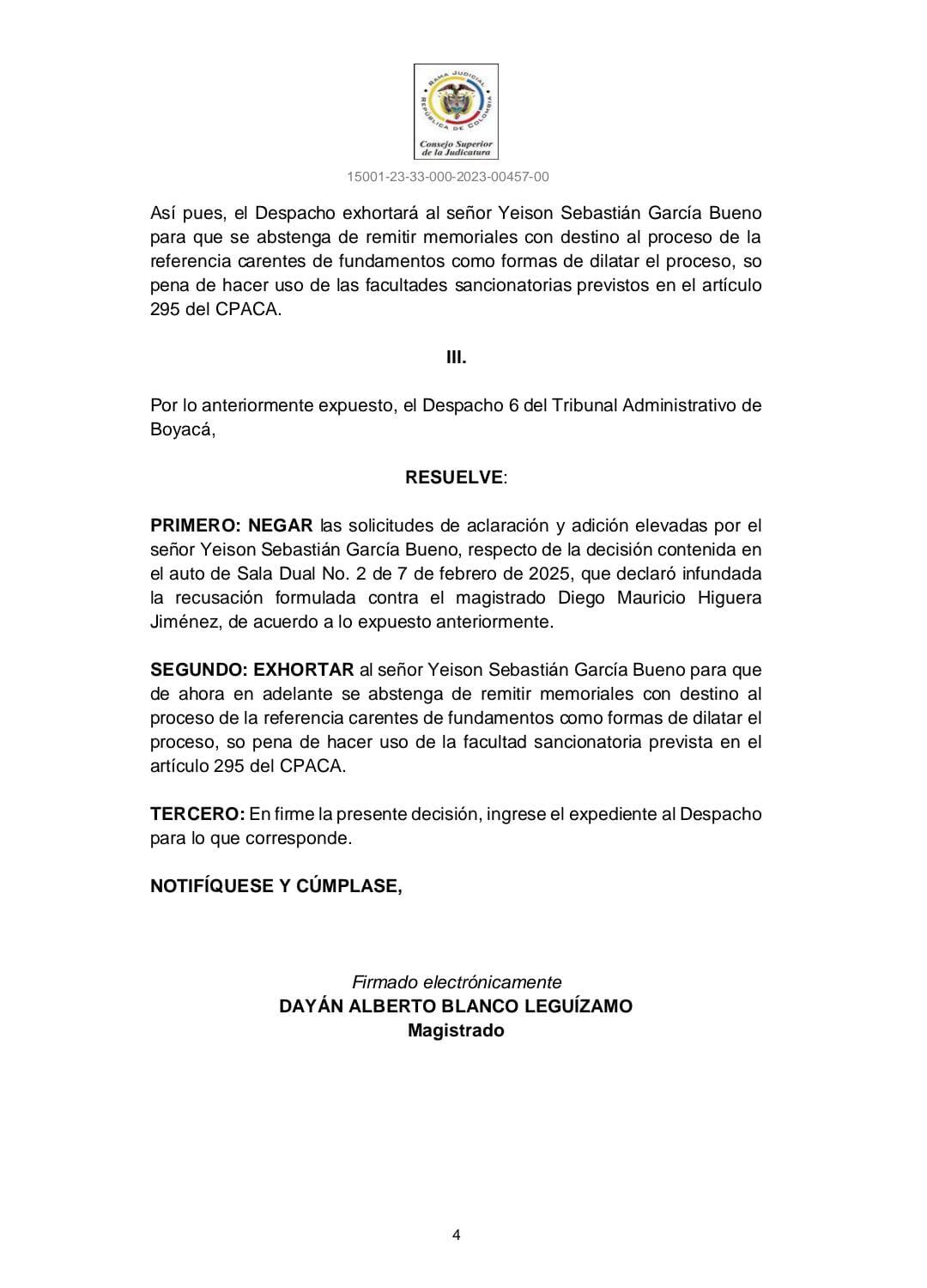 En tal sentido el magistrado decidió negar las solicitudes de aclaración y adición de Yeison Sebastián García Bueno, respecto de la decisión contenida en el auto de Sala Dual No. 2 del 7 de febrero donde se declaró infundada la recusación formulada contra el magistrado Diego Mauricio Higuera Jiménez y lo exhortó para que, “de ahora en adelante se abstenga de remitir memoriales con destino al proceso carentes de fundamentos como formas de dilatar el proceso, so pena de hacer uso de la facultad sancionatoria prevista en el artículo 295 del Código de Procedimiento Administrativo y de lo Contencioso Administrativo que advierte de las consecuencias por hacer peticiones impertinentes: ”La presentación de peticiones impertinentes así como la interposición de recursos y nulidades improcedentes serán considerados como formas de dilatar el proceso y se sancionarán con multa de cinco (5) a diez (10) salarios mínimos mensuales legales vigentes”.