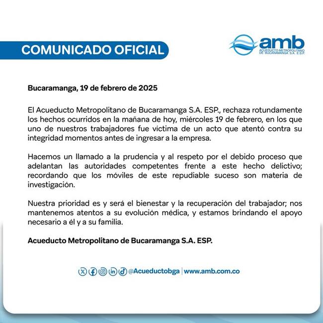El Acueducto Metropolitano de Bucaramanga informó sobre un hecho violento que se presentó en la mañana de este 19 de febrero en inmediaciones de sus instalaciones, hecho en el que uno de sus trabajadores sufrió un atentado con arma de fuego.