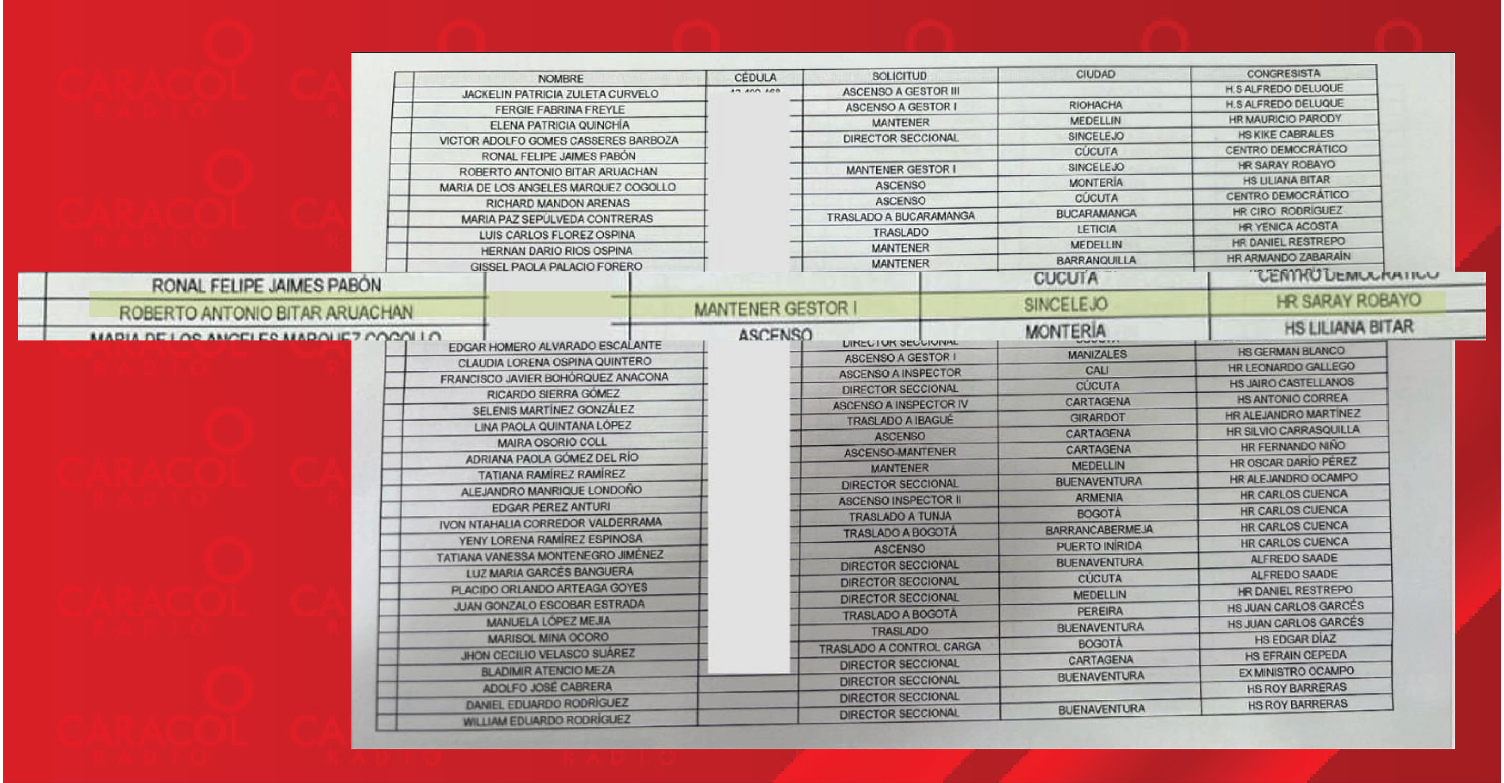 Según el listado, presuntamente, ella exigió mantener en la dirección seccional de la DIAN en Sincelejo, en el cargo Gestor I a Roberto Bitar Aruachán.La representante a la Cámara Saray Elena Robayo denunció al ministro Reyes por el delito de calumnia.