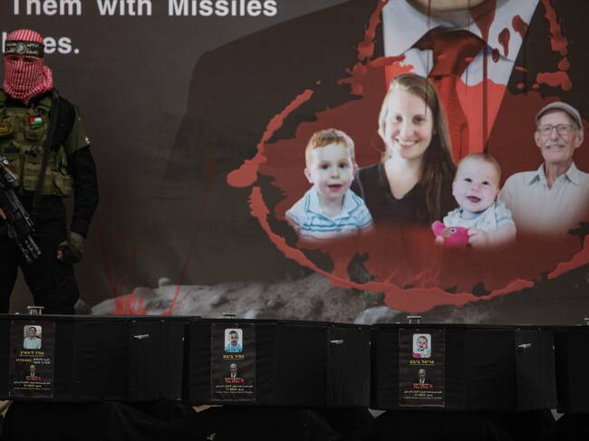 Los milicianos dispusieron sobre un escenario los ataúdes, de color negro y con los nombres de Shiri Silberman, mujer de ascendencia peruana y argentina capturada el 7 de octubre de 2023 con 32 años, y sus hijos, Ariel y Kfir Bibas, con 4 años y 9 meses respectivamente, así como el de Oded Lifshitz, que tenía 83 cuando fue secuestrado.