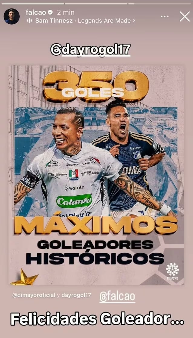 “Felicidades goleador”, escribió Falcao en la publicación, compartiendo la imagen que difundió en redes sociales la Dimayor en la que los destaca como los máximos goleadores.