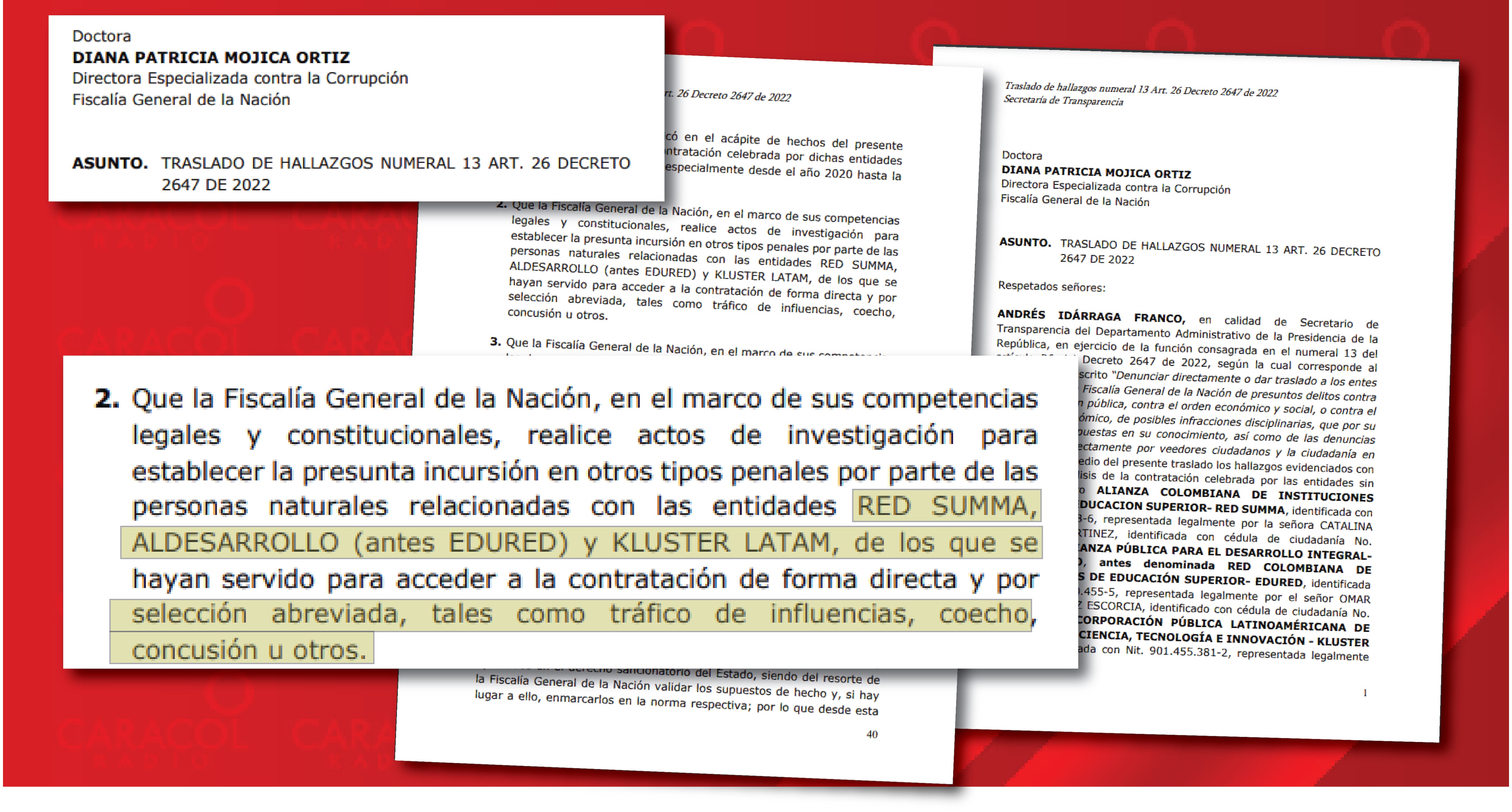 Caracol Radio conoció un informe de 54 páginas con destino a la directora anticorrupción de la Fiscalía, en el que se pidió investigar un presunto “carrusel de contratos” que supera los $1.3 billones y que involucra a tres entidades públicas sin ánimo de lucro que se “adueñaron” de la contratación pública bajo la modalidad directa en varias regiones del país. (ver documento)