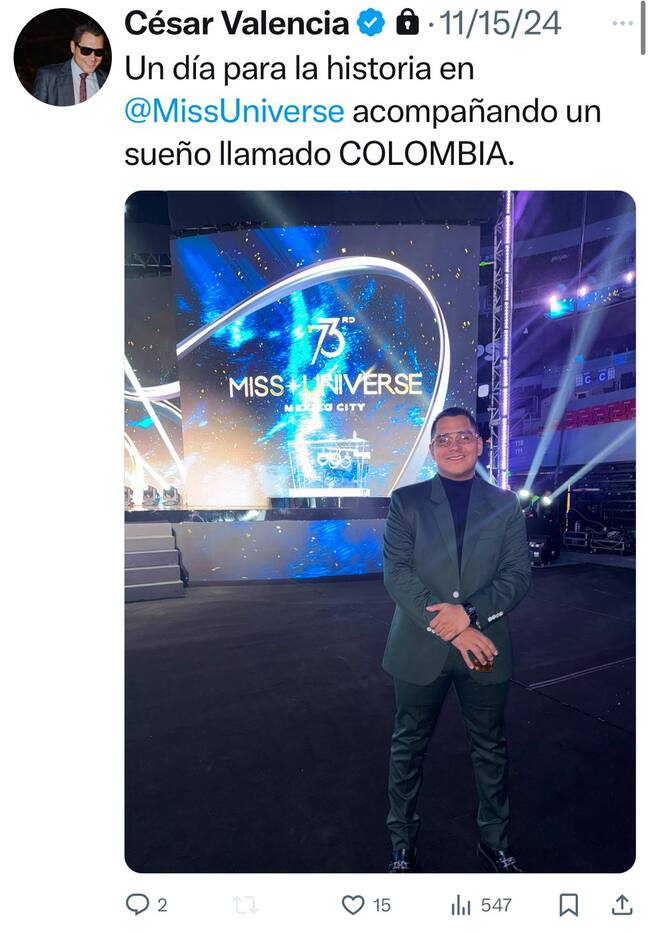 La siguiente fotografía lo retrata en México, el 15 de noviembre del 2024. En el vestíbulo de la ceremonia de Miss Universo, donde su novia representó a Colombia.