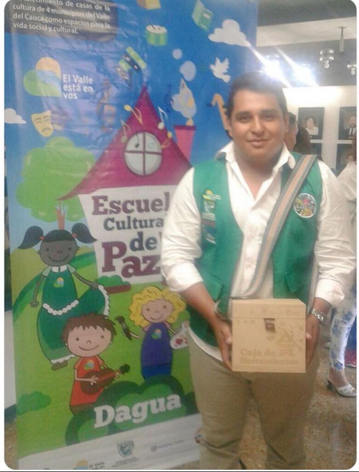 Viste un pantalón caqui y un chaleco verde con las insignias de “El Valle está en vos”, programa de la primera gobernación de Dilian Francisca Toro. La imagen fue tomada en Dagua, Valle, en una ceremonia para promover la cultura de paz.