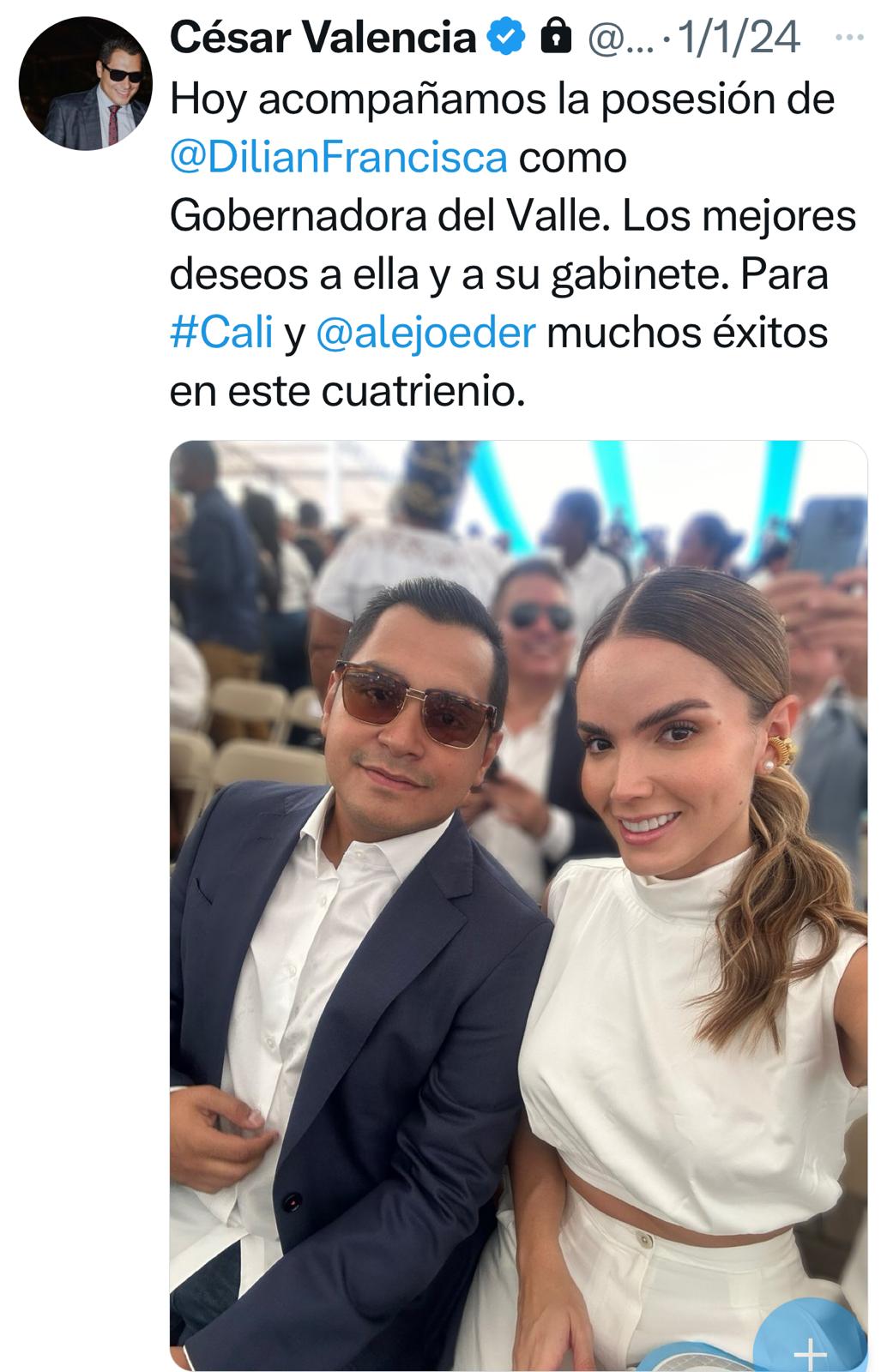 Valencia escribió “Hoy acompañamos la posesión de Dilian Francisca como gobernadora del Valle. Los mejores deseos a ella y a su gabinete. Para Cali y Alejandro Eder muchos éxitos en este cuatrienio”.